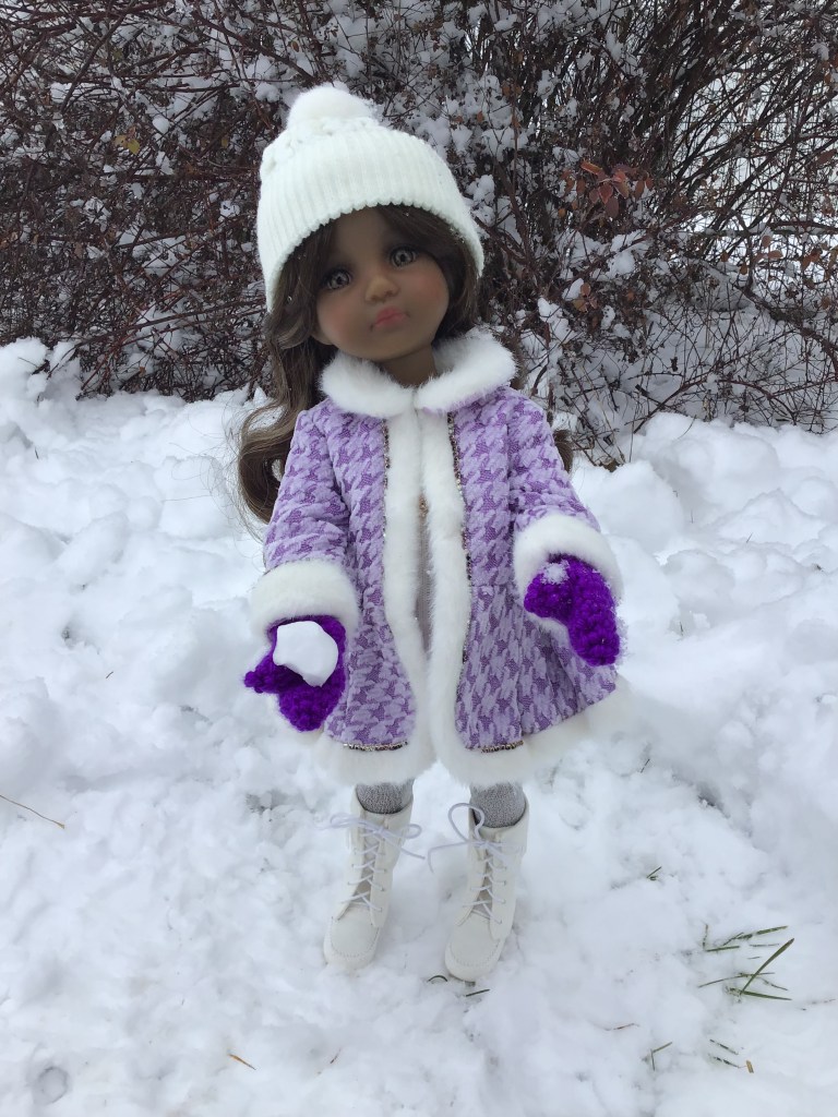 Models are Sara and Alex RRFF. My scarf, hats, and hex sweaters are being worn with my doll blanket sticking out of the tent.Grace LE (RRFF doll) is out playing in the snow. She is wearing a lovely pair of purple mittens made by me 😊
